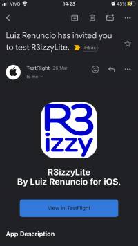 1. Verifique se você recebeu um e-mail do Testflight, com o título “Luiz Renuncio has invited you to test R3izzyLite.”;