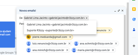 Atenção ao responder a emails de clientes. É importante que eles vejam somente os emails de financeiro@ e suporte@. Para isso basta selecionar qual deles deseja enviar como remetente, como na imagem abaixo.